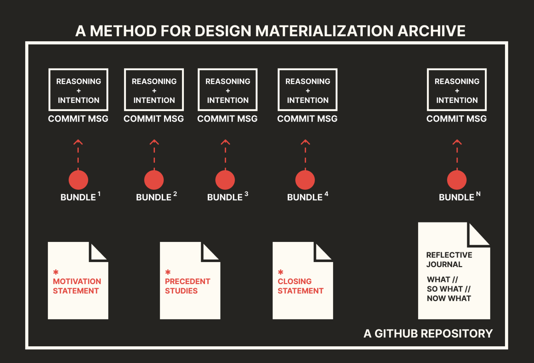MDM leverages version control processes, concepts, and technologies, but reorients them to privilege intentional documenting or tracing of design processes primarily involving digital materials: the repository of software development becomes the archive of digital design practice. Alongside housing code and assets, which are discretely grouped chronologically as "commit" bundles, a designer practicing MDM explicitly documents the evolution of their design motivations or intentions and their design reasoning and problem solving along the duration of design activity (which may factor in previous design experiences), using both descriptive and reflective forms of writing.