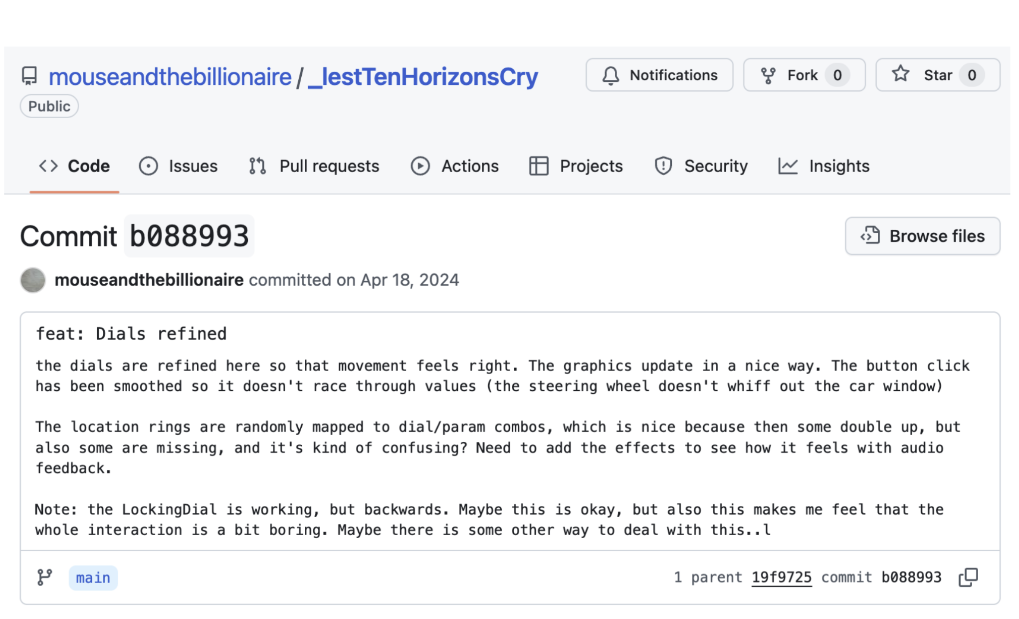 Descriptive and/or reflection-in-action accounts of design practice are reported for each set of materials bundled in a “commit” via use of Git commit messages. Commit messages are a foundational element of MDM that enable researchers to draw connections between material changes and designerly intention. Whereas in regular software development contexts, commit messages usually report on technical changes, in MDM a commit message acts as an annotation associated with a bundle of modified code or assets that expresses designerly reasoning and intention underlying the modifications. In Figure 2, we see how the designer of the alt.ctrl game Lest Ten Horizons Cry (LTHC) has used a commit message to not only describe what has technically changed (the dials), but how (the feedback loop involving a dial and a press, i.e. graphics as well as timing), as well as why (to make it better match to the author’s vision for how such a dial should operate).