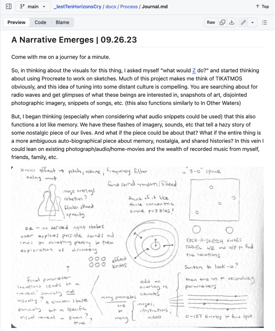 The academic design community typically does not have access to the interim materials that helped the designer determine how to go about solving their design problems. This is a shortcoming, as those materials often hold clues to why a designer did things in certain ways. Because GitHub stores repository contents online, so long as the designer adopts a mindset of “include all of it on the record”, it becomes possible for anyone not directly involved in the making process to later access these interim materials. These interim materials – which include assets, code, and builds – can be used to form a materially-informed understanding of the design problem context. Over time, with most materials being committed to the archive, the archive contains a fairly comprehensive capture of how project materials evolved over time.